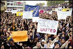 تظاهر آلاف القبارصة الأتراك مساء «الخميس» وللمرة الثالثة خلال شهرين مرددين شعارات ضد نظام الحكم «الديكتاتوري» شمالي قبرص وضد قبضة الجيش التركي الجاثمة منذ 28 عاماً بينما كانوا يحملون أعلام الاتحاد الاوروبي الزرقاء.فقد تظاهر ما لا يقل عن نشطاء 90 منظمة ما بين معارضة سياسية ومنظمات اجتماعية وعمالية تحت شعار «هذا البلد بلدنا» وطالبوا بتنفيذ خطة الأمم المتحدة الخاصة بإعادة توحيد الجزيرة وإنقاذهم من وضع اقتصادي متدهور.وبدأت منظمة تسمى «28 شباط/فبراير» إضراباً عن الطعام لجذب تأييد للموعد النهائي المقبل الذي حددته الأمم المتحدة للتوصل إلى تسوية بين القادة القبارصة اليونانيين والقبارصة الأتراك قبل تقديم وثيقة الانضمام إلى الاتحاد الاوروبي في 16 نيسان أبريل المقبل في أثينا.