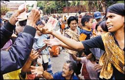 فقراء كمبوديون يمدون أيديهم لالتقاط ما جاد به هذا المحسن أمام كاميرات التصوير!!...لعله أراد أن تكون هذه العيون دليل إدانة للعالم المتحضر على ما وصلت إ.........