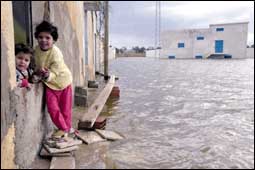 أطفال يلعبون بجوار منازلهم التي غطتها المياه في بلدة «جديدة» التي تبعد عن العاصمة تونس 20 كلم.