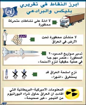 فيما يأتي النقاط الرئيسية في التقرير الذي عرضه أمس الجمعة أمام مجلس الأمن الدولي رئيسا فرق التفتيش الدولية في العراق هانس بليكس ومحمد البرادعي: