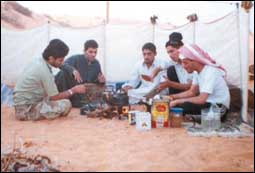 أدوات نصب الخيمة «عِدَّة» ومنها المسحاة والقدوام «فاروع» حبل للشد الخيمة، مطرقة، ومرابيع خشب، ماطور«وادواته الكهربائية» بما فيها اللمبات، والأسلاك. رابعاً المواد الغذائية المصاحبة للرحلة والضرورية: أرز، معكرونة، شاي، سكر، قهوة، هيل، حليب، زنجبيل، زعفران، نعناع، زيت طعام، زيت للقلي، زبدة، ملح، بهارات، شطة، كتشب، طماطم علب، صفار للطبخ، بصل، ملح ناعم وخشن، ليمون أسود، زبيب، ضروريات للسلطة ومنها:«خيار- طماطم- خس- جزر- ليمون اصفر» فواكه ومنها:«برتقال- موز- تفاح- رمان- كيوي- شمام-..» نواشف ومنها المعلبة مثل:الفول والبيض والحمص والجبن بأنواعه والزيتون والعسل والقشطة والطحينية.. وكذلك من الأدوات الهامة وتأخذها بكمية كبيرة إذا كنت بعيدا عن المدينة الخبز والكعك والمكسرات والكليجا إضافة إلى لحم الدجاج والذبيحة وان حصل أن تكون حية لتذبحها في البر وتسفيد من كبدتها في الفطور وكراعينها وكرشها بعد الغسيل الجيد لتعملها مقلقل أو «كمونية» على الطريقة السودانية، كذلك الثلج والمشروبات الغازية والتوت والتانج وأهم شيء ألا تنسى التمر السكري بنوعيه المضمود والمبرد إضافة إلى تمر الخلاص.. كما لا تنسى كرة القدم والطائرة وشبكاتها وقوائمها الخشبية أو الحديدية، كما أنوه على أهمية وجود حقيبة إسعاف أولية وهي موجودة في اغلب الصيدليات متكاملة وأن تحتوي على حبوب للمغص وللرأس وفوار للتهدئة ولفائف جروح متنوعة وضمادات ومسكنات للآلام ومخدر موضعي للضروس والجروح ومطهرات للخدوش..