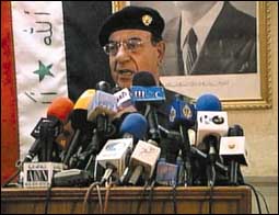قال مسؤولون امريكيون ان الرئيس صدام حسين قد يكون هو بعينه الذي ظهر في التلفزيون بعد الهجوم الامريكي ولكن يبدو ان خطابه كان مسجلاً.