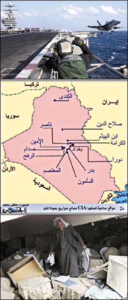 شاهد الرئيس الأمريكي جورج بوش بعض القصف الامريكي المكثف لبغداد على شاشة التلفزيون يوم الجمعة. وفقا للبيت الابيض.ولم يعرف رد فعل بوش على الحملة الجوية.........