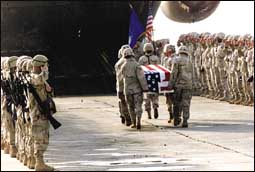 جنود أمريكيون في أفغانستان يصطفون لتحية زميلهم المحمول جثة هامدة ونقله الى بلاده ليدفن هناك.