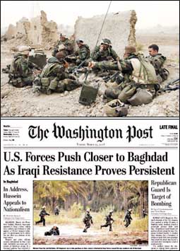 أبرزت الصحيفة بدء الهجوم الأمريكي على العراق وقالت إن القوات الأمريكية الغازية تندفع نحو بغداد لتخوض معركة حاسمة مع قوات الحرس الجمهوري العراقي حيث وصلت هذه القوات إلى منطقة تبعد عن العاصمة خمسين ميلا.