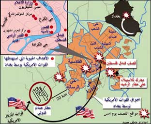 قال مسؤول امريكي ان الجيش الامريكي قصف يوم الاثنين هدفاً في بغداد ربما كان بداخله الرئيس العراقي صدام حسين وابناه.