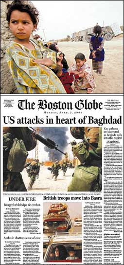 اهتمت الصحيفة بالحرب الدائرة في العراق وجاء المانشيت الرئيسي لها بعنوان «هجمات أمريكية في قلب بغداد.. احتلال القصور الرئيسية» وقالت ان ضابطاً أمريكياً.........