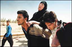 مواطن عراقي يحمل والدته على ظهره هارباً بها من حالة الفوضى التي عمت شتى المدن العراقية بعد حرب دامية احتدت أكثر من أسبوعين.
