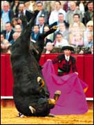 مساعد مصارع الثيران يقف مشدوهاً أمام الثور الذي انقلب رأساً على عقب في حلبة المصارعة ببلدة سيغيلي الأسبانية.