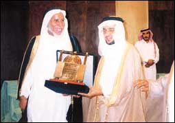 كما قدم الشيخ محمد بن ناصر الفالح رئيس لجنة الجائزة درعاً تذكارياً لوكيل الوزارة الدكتور محمد العصيمي بهذه المناسبة بعد ذلك أخذت لقطة تذكارية لسعادة وكيل الوزارة مع الطلبة المتفوقين وأمين الجائزة والسادة الشيخ محمد الناصر الفالح واخوانه.