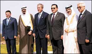 قمتا إيفيان وشرم الشيخ تؤكدان دعم خريطة الطريق ولقاء العقبة يلتئم اليومبوش أمام قمة شرم الشيخ: العالم بحاجة إلى دولة فلسطينيةمبارك: على إسرائيل تنفيذ التزاماتها الواردة في خريطة الطريقالفيصل:التطبيع مقابل عودة الأراضي واعتراف إسرائيل بالدولة الفلسطينية