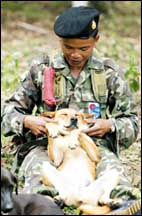 وبعد اسابيع وجد الكلب المشرد نفسه على الخطوط الامامية لجبهة تايلاند لمكافحة المخدرات ضمن 50 كلبا دربها العسكريون التايلانديون لمكافحة الارهاب والجريمة.........