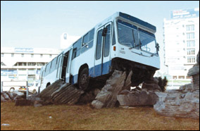 اضطر سائق حافلة تابعة لشركة النقل الجماعي الى القفز فوق مجسم صخري ضخم أمام مبنى يقع على تقاطع طريق ابن خلدون مع شارع الاتصالات الاتفاق في مدينة الدمام.........