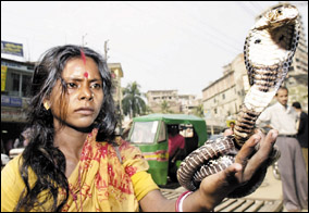 يلجأ الباعة المتجولون في بنجلاديش إلى جذب زبائنهم باستعراض ثعابين الكوبرا الخطيرة مثلما تفعل الفتاة في الصورة.