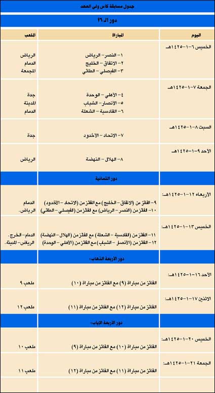 تنطلق مساء اليوم الخميس مباريات دور الستة عشر لمسابقة كأس سمو ولي العهد وستكون البداية بثلاثة لقاءات، حيث سيلتقي الرياض والنصر في (الرياض) والاتفاق والخليج في (الدمام) والفيصلي والطائي في (المجمعة) وستتأهل الفرق الفائزة إلى دور الثمانية بينما ستغادر الفرق الخاسرة المسابقة.