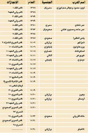 حقق 15 مدرباً 23 بطولة للفريق الأهلاوي رغم أن هناك اسماء تدريبية لامعة تعاقد معها الأهلي لكنها لم تحقق نتائج جيدة للفريق مثل العالمي (لازروني) و(لويس.........
