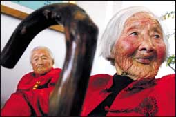 السيدة دينج يو شين وعمرها 104 أعوام لدى حضورها تجمعاً للمعمرين في مدينة روغاو الصينية، وتسمى هذه المدينة باسم (واحة المعمرين) أو (أرض المعمرين) حيث يو.........