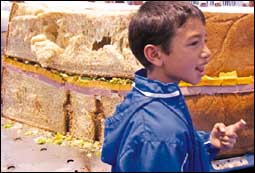 طفل يتذوق شطيرة (سندويتش) هي الأكبر من نوعها في العالم وتم اعدادها في المكسيك ويبلغ طولها 3.50 أمتار وتزن 3.178 كيلوغرامات.. ويتوقع ان تحقق رقماً قياس.........