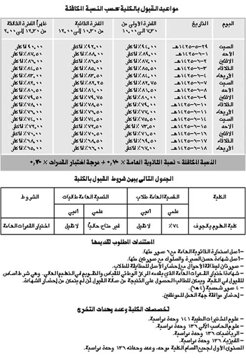 أعلنت كلية العلوم بالجوف التابعة لجامعة الملك سعود عن موعد فتح باب القبول والتسجيل في الكلية، وذلك اعتباراً من يوم أمس الأول السبت الموافق 29-5- 1425هـ ويستمر حتى يوم الاربعاء 18-6-1425هـ.