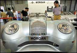* زائر صيني يشاهد سيارة بريطانية مترفة من طراز مورجان في معرض للسيارات أقيم في مدينة شنغهاي بالصين.