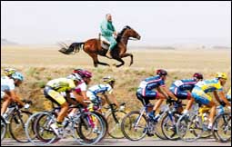 فارس مسن يمر قريباً من سباق الدراجات المسمى (حول أسبانيا) الذي يتكون من عدة مراحل ، حيث فاز في هذه المرحلة متسابق من إيطاليا.