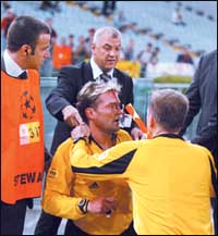 الحكم الجبان استبدل البطاقة الحمراء بالصفراء فاستحق تصفيق اللاعبين وهكذا تبقى الفرق المميزة تدفع ثمن أخطاء الحكام.