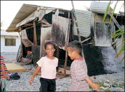 طفلان يلهوان في مدينة جينروك بجزر مارشال بجوار إحدى البيوت البدائية؛ حيث تعدُّ هذه المدينة من المدن الفقيرة في العالم؛ حيث لا يتوفر لسكانها المال لسداد ثمن الخدمات الأساسية كالماء والكهرباء وأنظمة الصرف الصحي.