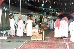 زدحم سوق الربوة بكل أنواع وألوان التمور، وخصوصاً مع بداية أول أيام الشهر الفضيل. هذه اللقطة تظهر بجلاء الإقبال الكبير من المشاركين في السوق، وكذلك المواطنين الذين تهافتوا على شراء التمور . * تصوير: عبد الله المسعود