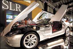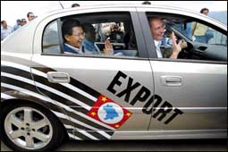 الصيني راي يونج رئيس فرع شركة جنرال موتورز الأمريكية في البرازيل مع حاكم اقليم ساو باولو البرازيلي يلوحان بأيديهما من داخل سيارة تم تصديرها إلى المكسي.........