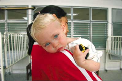طفل سويدي في غرفة العناية بأحد المستشفيات بعد نجاته وأخيه (3) سنوات ووالده من موجة الفيضانات بجزيرة فدكيت.. علماً بأن والدته في عداد المفقودين...(رويت.........