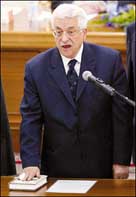 * رام الله - بلال أبو دقة - نائل نخلة - الوكالات: أقسم محمود عباس أمس السبت أمام المجلس التشريعي الفلسطيني اليمين القانونية ليصبح رسمياً رئيساً للسلطة الوطنية الفلسطينية، وأكد في كلمة ألقاها أن الشراكة مع إسرائيل لا يمكن أن تتم في ظل الإملاءات. وبعد أن تسلم روحي فتوح رئاسة جلسة المجلس التشريعي أعطى الكلمة للرئيس الجديد الذي باشر إلقاء خطابه بإهداء هذا الفوز للقائد الخالد ياسر عرفات، كما كان فعل بعد الإعلان عن النتائج الأولية التي أشارت إلى فوزه. وأعلن أبو مازن أن السلطة الفلسطينية تسعى للوصول إلى وقف متبادل لإطلاق النار لإنهاء دوامة العنف، كما أكد أن الخيار الإستراتيجي لمنظمة التحرير الفلسطينية هو خيار السلام العادل الذي يمكن التوصل إليه بالتفاوض. إلا أنه أضاف أن الشراكة ليسب بالأقوال بل بالأفعال وهي تمر بإنهاء الاغتيالات والحصار والاعتقالات ومصادرة الأراضي والاستيطان والجدار الفاصل وتدمير المنازل. وأضاف أن الشراكة لا يمكن أن تتم في ظل الإملاءات.. وتابع عباس في إشارة إلى العملية الفدائية التي وقعت في قطاع غزة مساء الخميس عند معبر المنطار وأدت إلى مقتل ستة إسرائيليين بعد أن كان قتل بضعة فلسطينيين قبلاً في الأيام الماضية وقعت جملة من الأحداث وهي مدانة من طرفنا سواء ما قامت به قوات الاحتلال الإسرائيلي وردود الفعل من بعض الأطراف الفلسطينية مما لا يساعد على تهدئة الأوضاع. وأضاف عباس إننا نسعى للوصول إلى وقف إطلاق نار متبادل لتنتهي هذه الدوامة من العنف. وأكد أن نهجنا سيبقى النهج الذي اتخذته منظمة التحرير الفلسطينية خياراً إستراتيجياً خيار السلام العادل الذي يمكن التوصل إليه بالتفاوض من أجل انتزاع حقوقنا الوطنية. ودعا اللجنة الرباعية إلى التدخل لتجنب إغراقنا في متاهة الحلول الانتقالية والجزئية طويلة الأمد التي تستهدف تأجيل دخولنا إلى الحل الدائم والشامل. وأكد عباس في هذا الإطار استعدادنا التام لاستئناف مفاوضات الوضع النهائي وتوفر الجاهزية السياسية عندنا للوصول إلى اتفاق شامل حول مختلف القضايا. ورفض محمود عباس الحلول الانتقالية والجزئية طويلة الأمد، مؤكداً الاستعداد التام لاستئناف مفاوضات الوضع النهائي. ودعا اللجنة الرباعية إلى التدخل لتجنب إغراقنا في متاهة الحلول الانتقالية والجزئية طويلة الأمد التي تستهدف تأجيل دخولنا إلى الحل الدائم والشامل. وخاطب عباس الشعب الإسرائيلي قائلاً: نحن شعبان كتب علينا أن نعيش جنباً إلي جنب وأن نتقاسم الحياة على هذه الأرض. وتابع قائلاً البديل الوحيد عن السلام هو استمرار الاحتلال والصراع. وأضاف لنبدأ في تطبيق خارطة الطريق وبالتوازي لنبدأ في بحث قضايا الوضع الدائم كي ننهي إلى الأبد هذا الصراع التاريخي بيننا وبينكم. وأعاد الرئيس الجديد للسلطة الفلسطينية تكليف رئيس الحكومة الحالي أحمد قريع تشكيل الحكومة الفلسطينية الجديدة. وجرت مراسم التنصيب في رام الله في وقت أعلنت فيه الحكومة الإسرائيلية قطع اتصالاتها مع السلطة الفلسطينية إثر العملية التي نفذتها مجموعة فلسطينية عند معبر المنطار (كارني) في قطاع غزة الخميس وأودت بحياة ستة إسرائيليين.