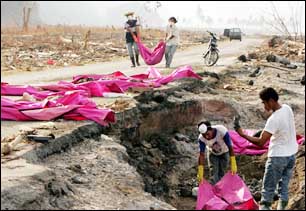 * باندا أتشيه - رويترز: بعد شهر من موجات المد البحري المدمرة (تسونامي) التي أعقبت زلزال المحيط الهندي قالت إندونيسيا أمس الخميس إنها دفنت جثث أكثر من 100 ألف من ضحايا الكارثة. وأصبحت الشاحنات التي يعمل عليها جنود ومتطوعون اندونيسيون والتي تقوم بإلقاء الجثث المنتفخة والمتحللة في حفر مكسوة بالجير مشهداً شائعاً في مختلف أرجاء إقليم أتشيه بجزيرة سومطرة الشمالية حيث سقط معظم القتلى. وبينما لا يزال حوالي 130 ألف شخص مفقودين ومع انتشال أكثر من ألف جثة يومياً من الأوحال والأنقاض في الطرف الشمالي من الجزيرة فإن عمليات الدفن قد تستمر لأسابيع. وقال بيان أصدره مركز أزمة تسونامي في باندا أتشيه عاصمة إقليم أتشيه: العدد الإجمالي للجثث التي تم دفنها هو 101199 جثة.. وعدد المفقودين 127749. وقالت وزارة الصحة الإندونيسية يوم الثلاثاء إن حوالي 230 ألف شخص قتلوا أو فقدوا نتيجة للزلزال الذي وقع في السادس والعشرين من ديسمبر كانون الأول وموجات المد البحري العاتية التي ضربت شمال سومطرة. وخلفت موجات المد حوالي 300 ألف بين قتيل ومفقود في الدول المطلة على المحيط الهندي من الصومال إلى تايلاند.. وقد صدرت إحصائيات جديدة أفادت أن حصيلة رسمية جديدة للضحايا نشرت أمس الخميس أن عدد القتلى أو المفقودين في المد البحري الذي ضرب إندونيسيا ودولاً آسيوية أخرى في 26 كانون الأول- ديسمبر الماضي بلغ 230261 شخصاً.