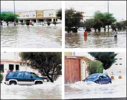 * الرياض - أحمد القرني - تصوير: سعيد الغامدي : لم تجد مياه الخير والتي تشكلت بفعل الأمطار الغزيرة التي هطلت على العاصمة الرياض يومي أمس الجمعة وأول من أمس الخميس لم تجد بداً سوى التجمع بكميات كبيرة في احتفالية تعكس المشكلة المزمنة في تصريف المياه في الرياض. وتجمعت مياه الأمطار في عدد كبير من الشوارع الرئيسية والأحياء مما أدى إلى شل حركة السير وتضررت العديد من المركبات التي لم يجد أصحابها حلاً سوى الترجل منها والبحث عن آلية أخرى للوصول إلى الأماكن التي ينوون الذهاب إليها.