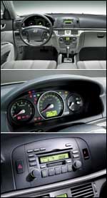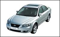 التصميم الداخلي أولت هيونداي المقصورة من الداخل عناية مطلقة لكافة التفاصيل، فاستعمال المواد ذات النوعية المتقدمة ودراسة المقصورة وتوفيرها بمساحات داخلية كبيرة، هي عناصر رفعت من قيمة هذه المقصورة التي تتحلى بلونين داخليين يفصل بينهما مساحة رقيقة من الخشب المصقول، أما المقاعد فهي من الطراز المزود بحواف جانبية تثبت أجسام الجالسين عليها، أما الطابع الرياضي فقد تم تعزيزه بمقبض علبة التروس الأوتوماتيكية التي يمكن التحكم بنقل نسبها يدوياً وبتجويف العدادات المبسط الذي يمكن رؤيته وقراءته بسهولة عالية، فيما تم تثبيت مخارج مكيف الهواء بحيث توفر هذه المخارج تبريداً متكافئاً في شتى أنحاء المقصورة ولينتج عن ذلك مقصورة تتمتع بجو من التناغم والتجانس والراحة المميزة. أما الألوان المزدوجة المتوافرة للداخل، فيمكن للمستهلك اختيارها، فيما يمكن الحصول على مقصورة مزينة بالخشب المصقول أوالمعدن اللماع. التجهيزات والأنظمة الداخلية زودت المقصورة الداخلية بمجموعة من التجهيزات المتطورة وتشمل مقوداً بقدرة تعديل أفقية وعمودية، جهاز منع غلق مكابح ABS يعمل من خلال مضخم يرفع من أداء نظام الكبح، جهازا للتوزيع الإلكتروني لقوة الكبح EBD، مرايا خارجية كهربائية مع نظام تدفئة لإزالة الغباش أوالصقيع، مصابيح أمامية بقدرة إنارة متفوقة، قفلا مركزيا كهربائيا، نافذة سائق كهربائية تعمل بلمسة واحدة مع نظام لإيقافها في حال اعترضها عائق ما، هوائيا مدمجا بالزجاج الأمامي، علبة قفازات مع قفل، غاسلات زجاج أمامي بمخارج ثلاثية لرش سائل التنظيف، مقابس كهربائية في صندوق الأمتعة، غطاء كهربائيا لخزان الوقود، فتحة كهربائية لغطاءي المحرك وصندوق الأمتعة مع نظام إنارة للمرايا المثبتة في حاجبي الشمس ومفتاح تشغيل المحرك. كذلك تشمل لائحة التجهيزات جهازا للتحكم بالسرعة، تحكما عن بعد بفتح وقفل السيارة، مكيف هواء أوتوماتيكيا بالكامل، مصافي لتنقية الهواء الداخل الى مقصورة الركاب، جهاز إنذار بوجود عوائق خلف السيارة، جهازا موسيقيا طراز MP3 مع مبدل لست اسطوانات مدمجة في لوحة القيادة، مع مضخم خارجي ومكبر للصوت ذي الترددات المنخفضة بقطر 8 إنش، وجهازا لإزالة الصقيع عن الزجاج الأمامي. التعليق ومستويات الضجيج تم تزويد سوناتا الجديدة بتعليق مستقل يعتمد على الشعب المزدوجة في الأمام والوصلات المتعددة في الخلف، في الأمام تم تجهيز سوناتا ببنية تحتية ترفع من صلابة الهيكل ويدعمها في ذلك أذرع سفلية على شكل حرف L باللاتينية تعمل على امتصاص ارتجاجات الطريق وتمنع وصولها الى مقصورة الركاب. كما تم الاعتماد على ركائز كبيرة تساهم بالتعاون مع ماصات الصدمات في تخفيض اهتزازات الطريق وترفع من مستويات الراحة. أما في الخلف، فقد أولت هيونداي عناية كبيرة لتوزيع الأوزان. يعتبر التعليق ذو التحكم التلقائي من خلال الهندسة النشطة AGCS من الابتكارات التقنية الخاصة بهيونداي التي أطلقتها للمرة الأولى في معرض سيول 2002 للسيارات. وتعمل تقنية التعليق ذي التحكم التلقائي من خلال الهندسة النشطة في الخلف وعبر جهازي استشعار كهربائيين يقومان بتعديل هندسة أذرع التحكم، مما يرفع مستويات التماسك عند الانعطاف ونوعية الانقيادية الى آفاق ومستويات جديدة. فنظام AGCS يتحكم بدرجة ميلان الإطارات حول محاور عمودية وأفقية وهمية، مما يرفع من نسبة تماسك الإطارات مع الطريق ويقلل من نسب انزلاق السيارة وبالأخص في المنعطفات. ولتخفيض مستويات الضجيج، تم الاعتماد على زجاج جانبي سميك وعلى أرضية شبه مسطحة مع تحسينات عديدة طاولت جهاز التكييف ومراوح التبريد الخاصة بمكيف الهواء والمحرك، ولينتج عن ذلك سيارة تتمتع بمستويات ضجيج منخفضة جداً سواء كانت السيارة متوقفة والمحرك يعمل أو عند القيادة. المحرك تتميز سوناتا الجديدة بمحركين جديدين تم تطويرهما خصيصاً لسوناتا، ويتميز هذان المحركان اللذان يتم بناؤهما وفقاً لأحدث الوسائل العصرية على خط تجميع مصنع آسان، برأسيهما المص