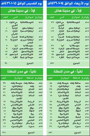 * حائل - عبدالعزيز العيادة: مازالت حركة تسجيل الناخبين في حائل تتأرجح صعوداً ونزولاً من مركز انتخابي إلى آخر في ظل تأثر حركة أرقام المسجلين في قيد الانتخابات بعدة عوامل ومنها توالي الأمطار واتجاه الكثيرين نحو الاكتتاب في بنك البلاد، إضافة إلى مصادفة هذين اليومين مع توقيت خروج العوائل الأسبوعي للرحلات البرية في المواقع الخلابة التي تشتهر بها عروس الشمال وإليكم حصيلة أرقام المسجلين بقيد الانتخابات خلال يومي الأربعاء والخميس 14 - 15-1-1426هـ: