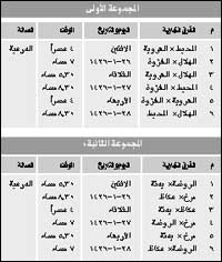 * المجمعة - صالح الدهش: تنطلق عصر اليوم الاثنين وحتى يوم السبت المقبل المرحلة النهائية لبطولة المملكة لدرجة الشباب في كرة اليد للصعود إلى دوري شباب الممتاز والتي تأهل إليها ثمانية أندية وزعت على مجموعتين وتستضيفها صالة الدرعية بالرياض، وتضم المجموعة الأولى الهلال- المحيط- الغزوة- العروبة. وتضم المجموعة الثانية وخ- الروضة- بدنة- عكاظ. وستقام كل يوم أربعة لقاءات وسوف يتولى الإشراف على النهائيات رئيس اللجنة الفنية للمسابقات باتحاد اليد الأستاذ فهد علي الوهيبي رئيس لجنة الحكام والأستاذ حسين باسنبل وقد تم تكليف حكام الرياض والخرج والمجمعة والزلفي لها بالإضافة إلى كل من سليمان الجري من القصيم وعبد الله الغفيلي من الرس وتيسير الخضبي ومحمد الحضي من الدمام، وسوف يعقد اجتماع الحكام ظهر اليوم الاثنين بمقر اتحاد اللعبة.وفيما يلي جدول مباريات النهائيات:
