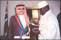 * الرياض - الجزيرة: استقبلت نائب الرئيس السيدة نجي سايدي في مطار بانجول الدولي بالعاصمة الجامبية صاحب السمو الملكي الأمير الوليد بن طلال بن عبدالعزيز آل سعود رئيس مجلس إدارة شركة المملكة القابضة والوفد المرافق يوم الأربعاء 16 ربيع الآخر 1426هـ 24 مايو 2005م. وعقد الأمير الوليد فور وصوله اجتماعا ثنائيا مع السيدة سايدي ومن ثم رافقت نائب الرئيس سموه في زيارة لمقر مؤسسة جمة للسلام، التقى خلالها بالمسؤولين في المركز الذي تبرع له سموه بمبلغ 500 ألف دولار أمريكي العام الماضي لدعم الجوانب الصحية والتعليمية بشكل عام وإنشاء مركز للتشخيص بشكل خاص. كما زار الأمير الوليد مدرسة يوندم Yundum التي استفادت من تبرع سموه الكريم. هذا وأقيم حفل خاص لسموه شارك فيه حكومة وشعب جامبيا للاحتفاء بمراسم افتتاح مشاريع الأمير الوليد الصحية والتعليمية في البلاد. وبعد الحفل الرسمي توجه الأمير الوليد للقاء فخامة الرئيس الجامبي الدكتور الحاج يحيى جمه، الذي رحب بالأمير الوليد بحفاوة وشكر سموه على زيارته للبلاد وخاصة في هذا اليوم الذي صادف يوم ميلاد فخامته، حيث حضر سموه الاحتفال الرسمي بهذه المناسبة التي تبعها اجتماع ثنائي مغلق مع فخامة الرئيس، تناقش خلاله الجانبان بشؤون اقتصادية واجتماعية وفرص الاستثمار المتاحة في جامبيا. وتقديرا لاهتمام الأمير الوليد بدعم جامبيا وجهوده في تطوير العلاقات السعودية - الجامبية قلد الرئيس سموه بأعلى ميدالية تمنح من قبل فخامته. وتعد هذه الزيارة الثانية لسمو الأمير، وكانت الزيارة الأولى العام الماضي وحينها قدم عمدة العاصمة بانجول اللورد با سالاه جنج لسمو الأمير الوليد بن طلال مفتاح البوابة الذهبية للمدينة. كما منح اللورد جنج سمو الأمير الوليد المواطنة الفخرية لبانجول وقدم لسموه شهادة بها.