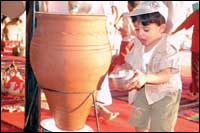 * بريدة - بدر العوفي: هل ياترى دار في خلد هذا الطفل وهو يستطعم الماء من (الزير) أن آباءه وأجداده لم يكن لديهم سوى هذا (الزير) لحفظ الماء بارداً، يروي ظمأهم، ويبل ريقهم بعد عناء يوم عمل أو عطش يوم حار، وفي أسوأ الأحوال ليس لديهم غير (الراقود) يشربون منه ويرتوون!! لا شك أن المهرجان جاء ليفتح أمام هذا الطفل وأقرانه النوافذ لقراءة الماضي وحياة الماضي وما كان عليه الناس آنذاك من شظف العيش وقلة المؤونة وكيف أن انسان هذا الوطن تجاوز تلك المرحلة بكل ما فيها من أسى وتعب وعطش وجوع إلى مرحلة الحاضر الزاهي والباهر. ولا شك أن صورة هذا الطفل وهو يشرب من الماء ب(طعم الماضي) ترسم صورة تغني عن ألف كلمة عندما يستحضرها ذهن إنسان الماضي.