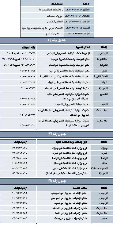 * الرياض - سلطان المواش: أعلنت وزارة الخدمة المدنية وشؤون تعليم البنات ووزارة الدفاع عن توافر وظائف تعليمية متبقية بعد انتهاء المرحلة الأولى من التقديم ومطلوب شغلها بمواطنات ممن يحملن المؤهلات والتخصصات المناسبة للوظائف المعلنة من الخريجات اللاتي سبق لهن التقديم في مفاضلات سابقة أو من الخريجات اللاتي لم يسبق لهن التقديم، وذلك حسب الآتي: أولاً: المؤهلات المطلوبة: الشهادة الجامعة في نفس تخصص المادة. ثانياً: مواعيد القبول: القبول على المتبقي من الاحتياج للمتقدمات من جميع المناطق وتعطى الأولوية للتربويات ثم غير التربويات. ثالثاً: الوثائق المطلوب إحضارها عند التقديم: 1- أصل الشهادة أو الوثيقة مع صورة منها موضحاً بها التقدير العام والنسبة المئوية أو المعدل التراكمي وتاريخ تحريرها. 2- صورة من دفتر العائلة موضحاً به السجل المدني للمتقدمة. 3- أصل شهادات الخبرة - إن وجدت - مع صورة منها بشرط ألا تقل مدتها عن عام دراسي كامل وأن تكون في طبيعة العمل ومكتسبة بعد المؤهل الأخير المراد التعيين به ومصدقة من الجهات التعليمية إذا كانت مكتسبة في القطاع الأهلي. 4- أصل شهادة التدريب مع صورة منها - إن وجدت - وفق الشروط التالية: - ألا تقل مدتها عن شهر. - أن يكون تاريخ الحصول عليها لاحقاً لتاريخ التخرج للمؤهل العلمي المتقدم به للمفاضلة. - أن يتم التدريب في أحد المعاهد أو المراكز التدريبية التابعة للأجهزة الحكومية أو في مراكز التدريب غير الحكومية داخل المملكة المرخص لها من الجهات التي تملك الصلاحية وأن تكون دوراتها التدريبية معتمدة من الجهات التي تشرف عليها. 5- أصل السنوات الدراسية الزائدة عن المؤهل مع صورة منها لمن يتوافر لديها ذلك. - ولا يعد التدريب والخبرة والسنوات الدراسية الزائدة من المتطلبات الأساسية للتقديم، ومن يتوافر لديها أي منها وتنطبق عليها الضوابط ستعطى نقاطاً إضافية بقدر ما لديها. 6- لن تتم إضافة أي خبرات أو أيّ وثائق أخرى للمفاضلة بعد انتهاء فترة القبول. رابعاً: مواقع تقديم الطلبات: يمكن للراغبات في هذه الوظائف التقديم في أقرب مكتب توظيف نسوي أو فرع للوزارة أو إدارة تعليم بحسب الموضح أدناه: 1- مكاتب التوظيف النسوية التابعة لوزارة الخدمة المدنية المحددة في جدول (1): 2- إذا كان مقر الوظيفة المعلنة يقع ضمن حدود إدارات التعليم في المناطق التالية، فيتم التقديم من قبل أولياء أمور طالبات الالتحاق بالوظائف المعلنة وذلك في فروع ومكاتب وزارة الخدمة المدنية المحددة في جدول (2): 3- إذا كان مقر الوظيفة يقع ضمن حدود إدارات التعليم في المحافظات التالية فيتم التقديم في مكاتب الإشراف التربوي في إدارات التعليم المحددة في جدول (3):