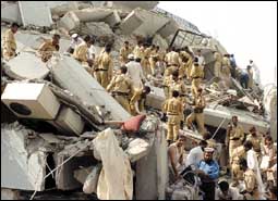 * إسلام أباد - الوكالات: قتل أكثر من ألف شخص في زلزال عنيف ضرب باكستان بقوة 7.6 درجات على مقياس ريختر وأوقع (أضراراً جسيمة). وقال المتحدث باسم الرئيس الباكستاني برويز مشرف: إن حصيلة قتلى الزلزال الذي وقع في شمال باكستان السبت قد تبلغ الآلاف. وقال الميجر جنرال شوكت سلطان بعد تفقد جوي للمناطق المنكوبة: (إن القتلى قد يقدّر عددهم بالآلاف.. ليس لدينا رقم دقيق للضحايا في هذه اللحظة ولكنه هائل). وأضاف أن منطقتي مانسهرة ومظفر آباد وهما منطقتان جبليتان في شمال باكستان والمناطق المتاخمة لهما من أسوأ المناطق المنكوبة تضرراً. وتابع (ألقينا نظرة من الجو بعد الهزات وبدأنا عمليات الإنقاذ.. تقوم طائرات الهليكوبتر العسكرية بنقل المصابين وكثفت من عمليات الإنقاذ). وضرب الزلزال البلاد في الساعة 0350 بتوقيت جرينتش وكان مركزه في الجبال المليئة بالغابات في الشطر الباكستاني من إقليم كشمير بالقرب من الحدود الهندية على بعد 95 كيلو متراً شمال شرقي إسلام أباد. وأفاد الناطق باسم الجيش الباكستاني الجنرال شوكت سلطان أن الزلزال العنيف أدى على الأرجح إلى مقتل أكثر من ألف شخص. وأوضح سلطان في العاصمة إسلام أباد (أن حصيلة القتلى قد تزيد عن الألف.. قد يكون هناك ضحايا كثر.. وكان الجنرال جواد شيما مدير خلية الأزمة في وزارة الداخلية الباكستانية قد قال في وقت سابق: إن حصيلة الزلزال (قد تصل إلى مئات القتلى) مشدداً على أن غالبية الضحايا سقطوا في شمال البلاد في كشمير الباكستانية وفي المناطق الجبلية شمال إسلام أباد. وأضاف (لدينا معلومات تشير إلى سقوط عشرات القتلى في كشمير في منطقة مانسيرا -50 كيلو متراً شمال إسلام أباد - وفي مناطق شمالية أخرى). وأوضح (لا تتوافر لدينا أعداد محددة لكن الحصيلة قد تكون كبيرة جداً). وقال مسؤول حكومي باكستاني: إن الهزة ألحقت (أضراراً جسيمة). وأضاف ضابط في الأجهزة الأمنية (تشير معلومات إلى انهيار منازل في مناطق مختلفة من وسط البلاد). وأوضح الجنرال شوكت سلطان (لدينا معلومات تفيد أن بلدة بكاملها دمرت في إقليم باق في كشمير)، مضيفاً أن مروحيات وجنوداً أرسلوا إلى المنطقة. وتتزايد المعلومات عن التدمير الذي خلفه الزلزال الذي وقع على بعد حوالي مئة كيلو متر شمال إسلام أباد، في أجواء من الفوضى ومع انقطاع الكثير من خطوط الهاتف. وأتت أكثر المعلومات خطورة من مناطق جبلية في شمال البلاد يصعب الوصول إليها بسبب وعورتها.. وأشار مسؤولون في الشرطة المحلية إلى أن هناك بلدات مدمرة ومنازل منهارة وعشرات الضحايا.. وحصلت انزلاقات تربة في عدة بلدات في سلسلة جبال هندوكوش (مئة كيلو متر شمال إسلام أباد) وفقاً لمعلومات مجتزأة جمعتها وكالة فرانس برس من السكان. وقال الضابط إقبال أحمد من شرطة ماسيرا: إن (90 % من منازل ثلاث بلدات في إقليم مانسيرا دمرت كلياً). وشعر كل سكان باكستان بالهزة فضلاً عن الدول المجاورة في شمال الهند وشرق أفغانستان. وقالت الشرطة الباكستانية: إن 25 شخصاً قتلوا على الأرجح في انهيار مبنى محكمة في شمال باكستان وقتل عشرة آخرون في انهيار مدرستين في المنطقة ذاتها. وفي إسلام أباد، انهار مبنى حديث مؤلف من عدة طوابق وتسعى فرق الإنقاذ إلى إخراج عشرات الأشخاص العالقين على ما يبدو تحت الأنقاض. وانتشل قتيلان ونحو ثلاثين جريحاً من أنقاض المبنى، حيث يقيم الكثير من الأجانب على ما أفادت فرق الإنقاذ. وقتل طفل على الأقل في انهيار مدرسة في راوالبندي الملاصقة لإسلام أباد على ما أفاد مسؤول محلي. وأفاد المعهد الجيولوجي الوطني الأمريكي والشبكة الوطنية لمراقبة النشاط الزلزالي في ستراسبورغ (فرنسا) أن قوة الزلزال بلغت 7.6 درجات على مقياس ريختر ووقع عند الساعة 3.50 بتوقيت غرينيتش. وحدد مركزه على بعد مئة كيلو متر تقريباً شرق سريناغار. وتلت الهزة الأولى التي استمرت ثلاثين ثانية، أربع هزات ارتدادية على الأقل مما أثار الذعر في السكان الذين نزلوا إلى الشوارع. وأوضح أن عدداً من المراكز المتقدمة للجيش انهارت في حين أصيبت أخرى بسقوط أشجار أ