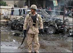 وقال مصدر في وزارة الداخلية طلب عدم الكشف عن اسمه: إن (مدنيين عراقيين قتلا وأصيب آخر في انفجار عبوة ناسفة لدى مرور دورية عسكرية أمريكية). وأوضح أن (الحادث وقع بالقرب من مجمع مشن التجاري في حي الرياضي جنوب بغداد)، مؤكداً (عدم إصابة الدورية الأمريكية بأي أضرار). وفي قرية البهبهان (65 كلم جنوب بغداد) أعلن متحدث باسم شرطة كربلاء أن (قوات الشرطة تمكنت من القبض على ثمانية مسلحين كان بحوزتهم صاروخان من طراز (كاتيوشا) فأبطلت مفعولهما، وصادرت كميات كبيرة من الأسلحة والمتفجرات الأخرى التي كانت بحوزتهم). وفي منطقة الطالبية شمال بغداد أعلن مصدر في وزارة الدفاع العراقية أمس إصابة عشرة عراقيين بينهم أربعة من رجال الشرطة في انفجار سيارة مفخخة استهدفت دورية للشرطة.