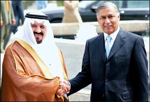 موضحا بأن البلدين يتابعان التطورات والأحداث وجسامة القضايا التي تواجه أمتنا الاسلامية التي تتطلب من البلدين زيادة التشاور والتعاون لنتمكن معا من تحقيق ما تصبو اليه شعوبنا، منوها بما يحصل للشعب الفلسطيني من ظلم ومعاناة وأن الأمة الإسلامية تتطلع الى أن يستتب الامن والاستقرار في العراق ليستعيد مكانته في الامتين العربية والإسلامية. وشدد سموه على ان الإرهاب خطر يعاني منه العالم أجمع وأن بلدينا في مقدمة الدول التي حاربت الإرهاب ولا تزال تحاربه وتنبذ التطرف وذلك انطلاقا من جوهر تعاليم ديننا الإسلامي ونوه سموه بمسيرة الحوار التي انتهجتها باكستان في علاقاتها مع جارتها الهند لانها السبيل الامثل لحل المشكلات والنزاعات بالطرق السلمية ولقد آن الاوان للتوصل إلى حل عادل وسلمي لقضية كشمير ونرجو ان يمتلك البلدان الرؤى الصائبة والقدرة على مواصلة مسيرة السلام بينهما واقامة علاقات دائمة من حسن الجوار بما يعزز الامن والسلام في المنطقة وفي العالم.
