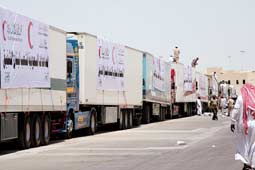 سيّرت المملكة أمس 30 شاحنة محملة بالمساعدات الغذائية والطبية إلى الأشقاء اللبنانيين، وقد غادرت 15 شاحنة من مدينة الرياض، فيما غادرت 15 شاحنة أخرى من مدينة جدة متجهة إلى مدينة دمشق، ومن ثم إلى بيروت لتصل إلى المستشفى الميداني السعودي. وأوضح رئيس جمعية الهلال الأحمر السعودي بالإنابة الدكتور صالح بن حمد التويجري أن هذه المساعدات عبارة عن 580 طناً من المواد الغذائية و80 طناً من الأدوية الطبية تم شحنها على 33 شحنة، إضافة إلى سيارة إسعاف وجرافة.