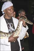الممثل صموئيل جاكسون وهو يحمل أفعى أثناء افتتاح فيلمه السينمائي الجديد (أفاعي على أي طائرة)