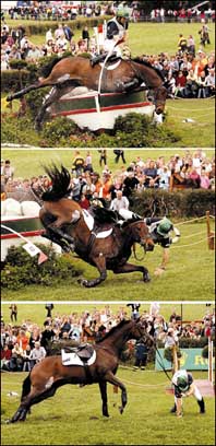شريحة من ثلاث صور للخيال الأسترالي شين روز وهو يسقط أثناء قفزه لأحد الحواجز في مسابقة ألعاب الفروسية العالمية