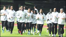 * جدة - محمد عطية: أدى منتخبنا الوطني الأول تدريباته مساء أمس الاول السبت على استاد الأمير عبدالله الفيصل بجدة عند الساعة الحادية عشرة مساء بعد انتهاء تدريبات المنتخب اليمني وقد شارك في التدريبات جميع اللاعبين باستثناء اللاعب حمد الصقور بسبب الإصابة فيما تم استبعاد لاعب الوسط خالد عزيز من قبل الجهاز الفني وقد استعان المدرب بأربعة من لاعبي الاتحاد لاستكمال العدد واشتمل التمرين على النواحي اللياقية وتطبيق بعض الجمل التكتيكية وإجراء مناورة بين اللاعبين. ومن جهة أخرى ادى المنتخب تدريباته مساء امس الاحد على ملعب نادي الاتحاد نظراً لانشغال الاستاد الرياضي بمباراة الاتحاد والقادسية.