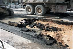 لم يمض سوى ساعات قليلة على ردم وسفلتة أعمال الحفريات التي جرت في شارع المغيرة بن شعبة في حي الملك فهد بالرياض حتى انكشف الغطاء الإسفلتي مرة أخرى بعد حدوث انهيار مفاجئ كان من الممكن أن يشكل خطورة على سالكي الطريق، لكن بقاء المعدات وأعمال الشركة المنفذة في مكان قريب من الحادث أنقذ الموقف حين بادر سكان الحي بالشكوى إلى البلدية.