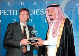 * الرياض - هلال القرشي: تسلم السيد بيل غيتس الدلة العربية كهدية من أمير منطقة الرياض، أمير الأصالة، سلمان بن عبدالعزيز، كان ذلك في القاعة الكبرى بفندق الفورسيزون بالرياض خلال منتدى التنافسية الدولي الأول الذي عقد تحت رعاية خادم الحرمين الشريفين يحفظه الله. وكان للدولة السعودية