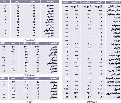 * الطائف - عليان آل سعدان: كشف تقرير حصلت عليه (الجزيرة) عن نتائج الحملات الأمنية التي نفذتها شرطة الطائف وأفرع الأمن العام والجهات الأمنية الأخرى المساندة عن العديد من القضايا الأمنية التي تمَّ ضبطها في محافظة الطائف ورنية والخرمة وتربة خلال الفترة من 1-7-1427ه إلى 30-9-1427ه، والتي جاءت على النحو التالي: أولاً: بلغ عدد الحملات الأمنية خلال هذه الفترة 73 حملة شارك فيها من شرطة الطائف 27 ضابطاً و275 فرداً و6 موظفين و40 آلية.. ومن أفرع الأمن العام 82 ضابطاً و376 فرداً و27 موظفاً و75 آلية.. ومن الجهات الأمنية المساندة 139 ضابطاً و243 فرداً و6 موظفين و150 آلية. وبيَّن التقرير عن أنواع القضايا التي تمَّ ضبطها خلال هذه الحملات حسب الجدول رقم (1) وبيَّن التقرير جنسيات كل من تمَّ القبض عليهم خلال هذه الحملات في جميع القضايا الجنائية والمرورية وقضايا أخرى منها الاشتباه الجدول رقم (2) كما تطرَّق التقرير إلى مخالفات نظام الإقامة في البلاد، وأشار إلى أنه تمَّ خلال فترة الحملة ضبط 650 من جنسيات مختلفة في محافظة الطائف وضواحيها جاءت حسب الجنسيات الجدول رقم (3) كما أشار التقرير إلى عدد المتسولين الذين تمَّ القبض عليهم خلال الحملات الأمنية خلال هذه الفترة وبيَّن بالتفصيل العدد والجنسية حسب حسب الجنسيات الجدول رقم (4)