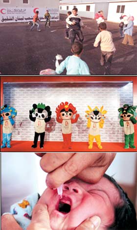 *** (مدينة جديدة) مجموعة من أطفال قرية عيطرون في جنوب لبنان يلعبون خارج منازلهم الجديدة الجاهزة الصنع التي تبرعت بها المملكة العربية السعودية بعد الحرب الشرسة للجيش الإسرائيلي على لبنان. *** (أطفال الهند) طفل هندي صغير يتلقى تطعيماً